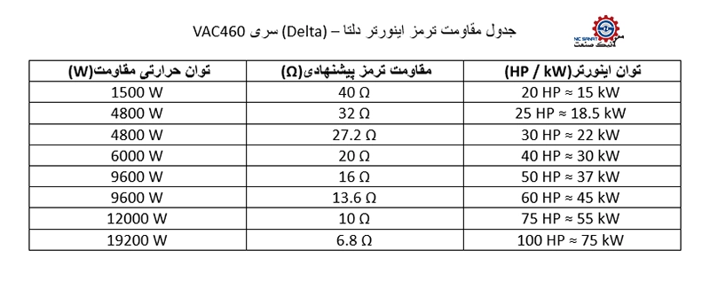جدول مقاومت ترمز اینورتر دلتا (Delta)