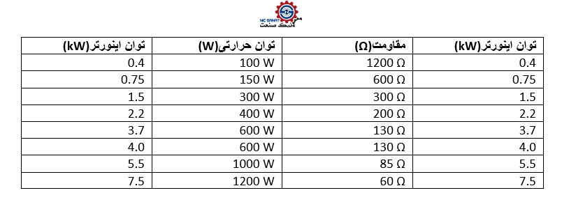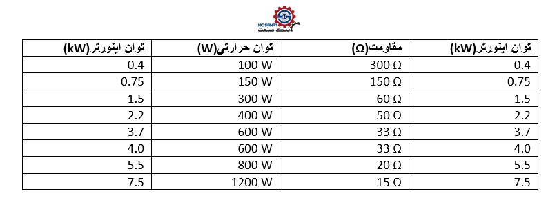 جدول مقاومت ترمز اینورتر