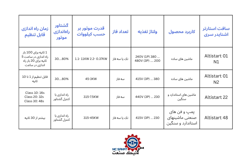 شرکت Schneider Electric سافت استارترهای خود را با نام تجاری Altistart (ATS) در مدلهای متنوع تولید کرده است. هر مدل برای شرایط خاص طراحی شده و تفاوت اصلی آنها در توان قابل پشتیبانی، نوع کاربری و امکانات حفاظتی است. مهم ترین سریهای این برند عبارتاند از: