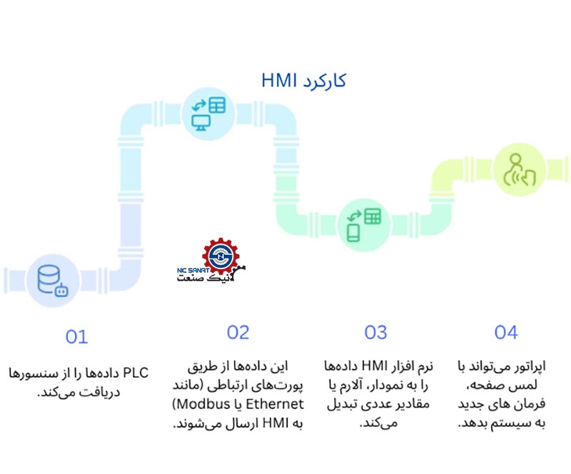 - نرمافزار HMI دادهها را به نمودار، آلارم یا مقادیر عددی تبدیل میکند.